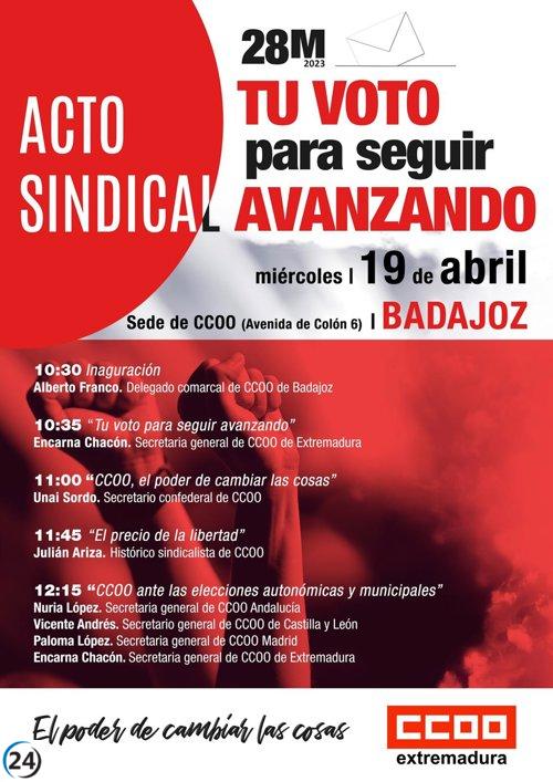 Unai Sordo y Encarna Chacón lideran acto CCOO en Badajoz antes de elecciones.