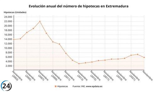 Caída histórica del 45,44% en la firma de hipotecas en Extremadura durante noviembre, posicionándose como el segundo peor registro a nivel nacional.